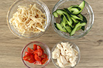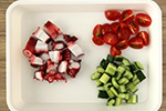 ミニトマトはヘタを取り4等分に切り、きゅうりは縦半分に切って種を取り除き1cm角切りにする。 -