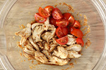 ボウルに(A)を入れ混ぜ、ささみとミニトマトを加えて混ぜ合わせる。