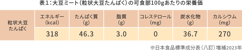 大豆ミートは「畑の肉」とも呼ばれる大豆を原料としています。大豆は高たんぱくであるほか、コレステロールは含まず、不足しがちなカルシウムを含んでいます(表1)。