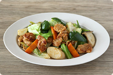 - 野菜に塩味のある調味料が加わると野菜から水分が出るため、味が薄くなりやすく、また、仕上がりもべちゃっとなりがち。あらかじめ調味料と少量の片栗粉を混ぜ合わせてから一気に加熱することでほどよくとろみがつき、少ない調味料でも野菜とよく絡んで水分も出にくくなります。(少ない調味料で仕上げることで減塩にも!)