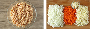 たまねぎ、にんじん、セロリ、にんにくは粗みじん切りにする。 -