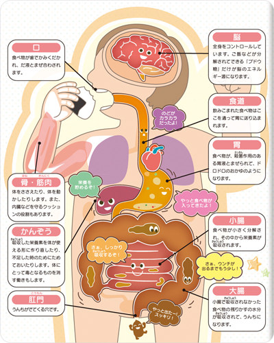 口から入った食べ物は、肛門へと続く1本の長い管(消化管)を通りながら、小さく分解(消化)されて、必要な分は体に取り込まれます(吸収)。この「消化」「吸収」をするために、胃や腸など内臓が活発に動きます。このときにエネルギーが使われて熱が発生するのです。これが、食事をすると体温が上がる理由です。
