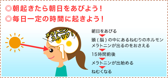 私達が夜眠くなるのは、頭の中にある「メラトニン」というホルモンが出ることで眠りをさそうのだそうです。夜暗くなるとメラトニンがたくさん出てきて眠くなり、朝に明るい光をあびると、メラトニンが出るのがおさえられ、目が覚めてくる、というしくみです。