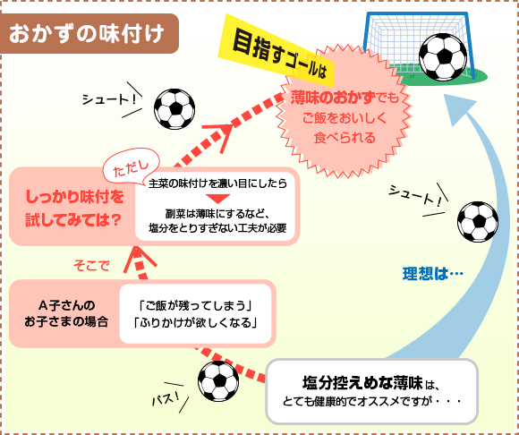 主菜や副菜の味付けにメリハリをつけて、全体の塩分が多くならないようにすると良いと思います。