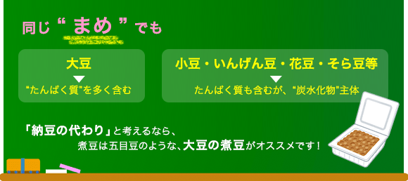 納豆の仲間(大豆・大豆製品)を日々の食事に取り入れていれば、大豆の栄養パワーは体に取り入れることができる、というわけです。