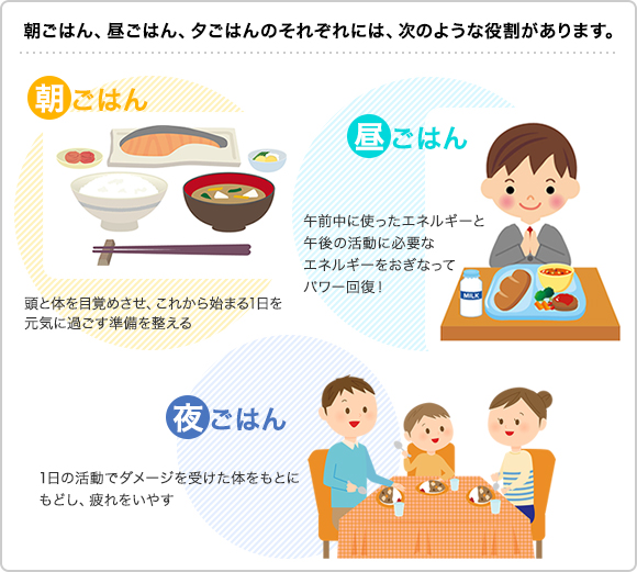 どの食事にも大切な役割があるので、主食・主菜・副菜をそろえて「しっかり」食べることを心がけてくださいね!