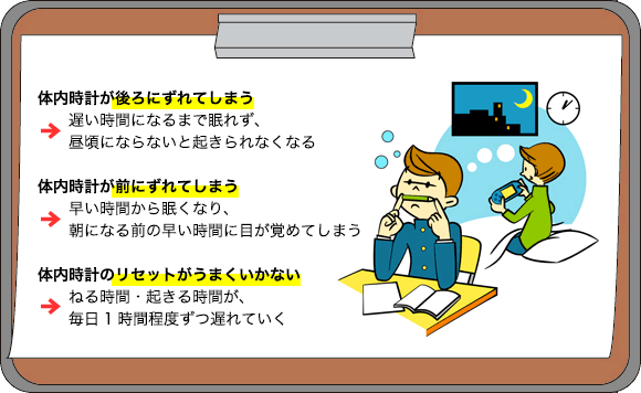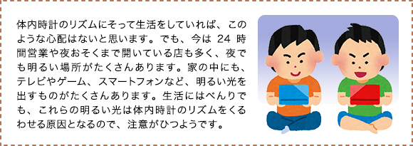 体内時計がくるってしまうと、その「朝に起きて、昼間は学校に行って、夜にねむる」ができなくなってしまいます。