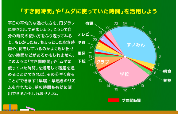 調子の悪い状態では集中力も十分に発揮できず、宿題も余計に時間がかかってしまい、また寝る時間が遅くなる・・・ということも考えられます。毎日の寝る時間・起きる時間をなるべく一定にしながら、平日の睡眠時間をもう少し増やせるように、なんとか工夫したいものです。