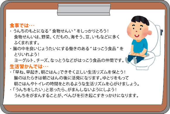 腹痛や下痢などの症状が気になるときにはお医者さんに相談してほしいのですが、ふだんから好きな遊びやスポーツなどで気持ちをリフレッシュしたり、うんちのリズムをととのえて腸の調子を良くしておくことも大切ですね。