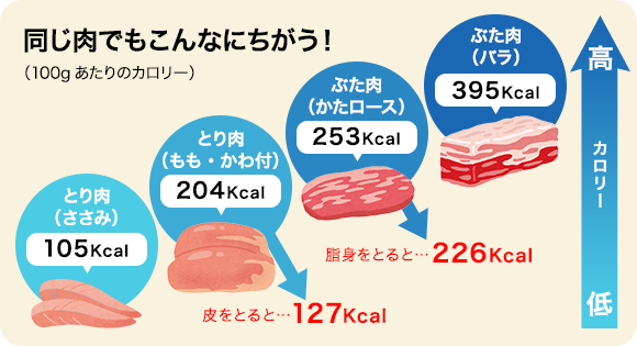 同じ「肉」の仲間でも、何を選ぶかでずいぶんカロリーが変わりますね。また、脂身や皮があるかないかで、カロリーに違いがあることもわかります。その差はどこからくるかというと、「アブラ」つまり脂質です。カロリーの低いささみに含まれる脂質の量が0.8gであるのに対して、カロリーの高いバラ肉に含まれる脂質の量は35.4g(いずれも100gあたり)。ささみの約44倍もあるんです!脂質の少ない肉は、太りにくいだけでなく、たんぱく質がより豊富でもありますので、成長期のお子さんにもとてもオススメです。