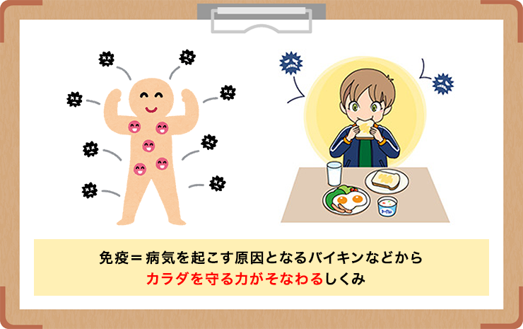 最近、「免疫(めんえき)」という言葉が、テレビなどでもよく聞かれるようになりました。「免疫力をアップ!」など、なんとなく体によさそうなイメージはあると思うのですが、どんなものなのかあまりピンとこないかもしれませんね。