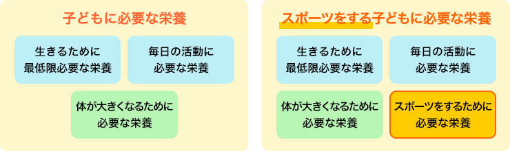 しかし!!「ぼくは柔道をやっているから、筋肉をつけるためにたんぱく質をたくさんとればOK」「私はマラソンをやっているから、とりあえず炭水化物だけ食べておけばいいわ!」という考え方は間違いです。コンディションの整った体を作るためには、他にもたくさんの栄養が必要だからです。1つ目の質問でお話しした「スポーツをする子どもの朝ごはん」と同じように、①主食 ②主菜 ③副菜 ④牛乳・乳製品 ⑤くだもの の5つをそろえたバランスの良い食事をベースに「たんぱく質を意識してとる」「炭水化物を多めにとる」のが正解!しっかり練習して、上手に食べて、最高のパフォーマンスを発揮してくださいね!