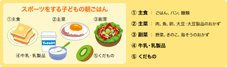 では「どんなものを食べるか?」ですが、基本的にどんなものを食べてもOKです!ただし、1回の食事に次の5つをそろえるようにしましょう。そうすると、スポーツをする子どもに必要な栄養をまんべんなくとることができます。