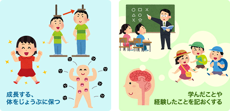 つまり、ねる時間をしっかりとれば、頭と体を十分に休めることができるだけではなく、「じょうぶに成長する」「学習したことをしっかり覚える」ということにもつながってくるということです。 ねている間には、私たちにとってとても大切なことが行われていることがお分かりいただけましたか?小学生のみなさんでしたら9~11時間を目安に、ねむる時間をしっかりとりましょうね。