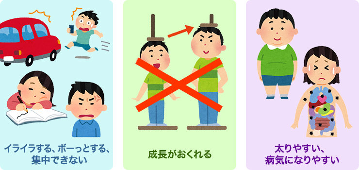 ねむる時間が足りないと、体と心に悪いことがたくさん起こります。例えば、学校に行ってから授業中にねむくなってしまったり、なんだかやけにイライラしたり、ボーっとして授業に集中できなかったり・・・。外を歩いているときにボーっとしていて、転んでケガをしてしまったり、交通事故にまきこまれてしまったりしたら大変です!また、体がぐんぐん大きくなる “成長期” にいるみなさんがねむる時間をしっかりとらないと、成長がおくれてしまうことにもつながります。