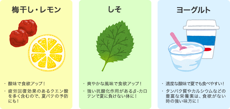 レモンや梅干しなど酸味のある食材はサッパリと食べられるので、食欲のない夏には特にオススメです。市販の調味酢(すし酢、酢の物・ピクルス用の酢など)を料理に活用するのも良いですね!