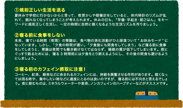 食事のとり方や生活習慣、眠りやすい環境を見直し、暑い夏もぐっすり眠って毎日元気に過ごしましょう!
