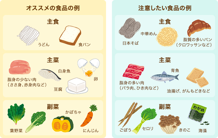 ・「炒める」「揚げる」など、油を多く使う調理法を避け、「ゆでる」「蒸す」「煮る」などの調理法を選ぶ