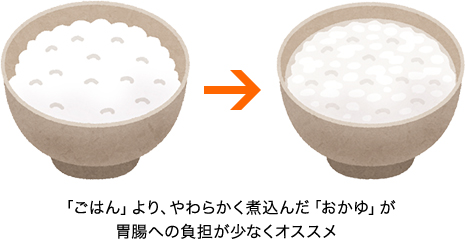 胃腸の機能が低下すると、食べたものをうまく消化することができず、お腹が痛くなったり下痢をしたりします。そのような時には、胃腸に負担をかけない(=消化の良い)食事を心がける必要があります。