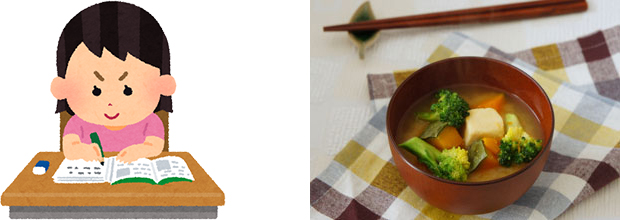 また、「塾などに行く前には、夕食の時間を十分にとることができない」という場合には“分食作戦”はいかがでしょうか。分食とは、1回の食事を分けてとることです。出かける前に、おにぎりなどでエネルギー補給をしておき、帰宅後の食事は消化の良い軽めの料理を食べるようにします。お腹が空いていると、ハンバーグや空揚げなど肉料理をガッツリ食べたくなるかもしれませんが、脂質の多い料理は消化に時間がかかってしまうので、夜食では避けるようにしましょう。豆腐やささみ、野菜などを煮込んだスープや鍋物などは、胃腸への負担をおさえることができてオススメです!