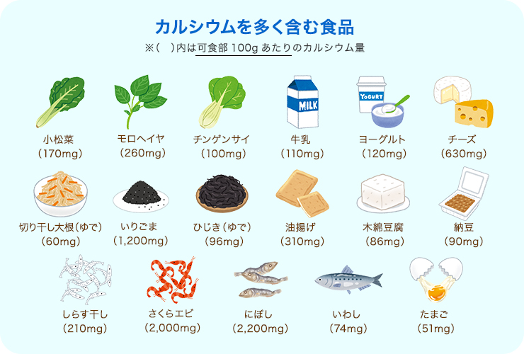 牛乳・乳製品、青菜、小魚や海藻など、色々な食品にカルシウムが多く含まれています。なお、図の中のカルシウム量は「食品100g中」に含まれる量です。実際に食べる量が少ない食品(しらす干しやさくらえびなど)では、カルシウムの量はその分少なくなるので注意が必要です。その点では、牛乳や乳製品は1度にある程度まとまった量を食べる(飲む)場合が多い上に、カルシウムが体の中で吸収されやすいのでオススメです。