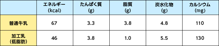 「低脂肪牛乳」の場合は、脂質以外の栄養素は、普通の牛乳とほとんど同じです。一方、「加工乳」の低脂肪タイプの場合は、脂質以外の栄養素の量にも違いがでてきます。
