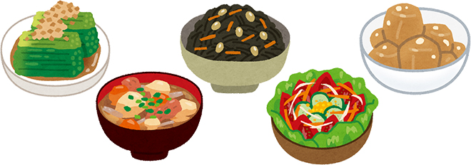 例えば、きゅうりとわかめの酢の物、具沢山の味噌汁、ひじきの煮物、野菜炒め、おいもの煮っころがしなどが副菜のメニューとしてあげられます。