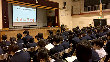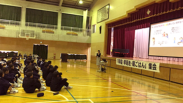 2018年4月27日:潮来市立潮来第一中学校の学生と保護者の方に向けて食育講座を行いました。 「12時以降に就寝する人の割合」や「朝食摂取状況」など、生徒のみなさんの実際の生活習慣データを一緒に見ながら「なぜ寝る時間が遅くなってしまうのか」という振り返りができたのではないかなと思います。 体温や食事誘発性熱産生といった少し難しい話題も交えてお話しましたが、皆さん一生懸命聞いてくださっていたのが印象的でした。 中学生はまさに成長のスパートをかける大切な時期でもあります! 「早寝早起き朝ごはん」を通して皆さんの成長期がより豊かなものになりますように陰ながら応援しております。