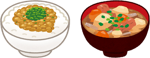 ごはんやパンなどの主食に多く含まれる糖(とう)質をエネルギーとして使うときには、豚肉や大豆に多くふくまれるビタミンB1を一緒にとることが出来ると良いでしょう。朝ごはんであれば、納豆やみそ汁をプラスすると良いでしょう。その際、みそ汁にとうふや野菜などを入れ具だくさんにすることで、ケガの予防や疲れをとるのにも役立つタンパク質やビタミンを一緒にとることが出来ます。