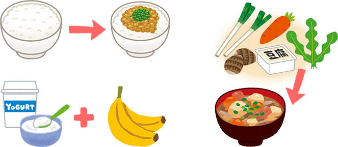 ごはんを納豆ご飯にする、味噌汁を具沢山にする、調理の必要がないヨーグルトやバナナなどをプラスする。