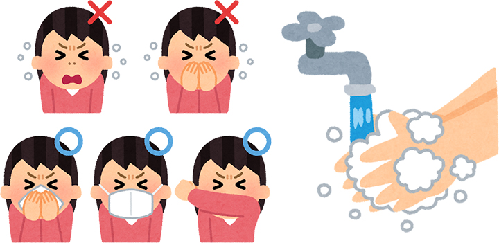 まず徹底したいのが、「咳エチケット※」や「手洗い」です。なぜこれらが大切かというと、新型コロナウイルスなどのウイルスは、感染した人が咳やくしゃみをした時にウイルスが含まれた鼻水やだ液が飛び散り、それが周りにいる人の鼻や口から入りこんで感染する「飛沫感染」や、ウイルスがついた手が鼻や口などに触れることで感染する「接触感染」によって感染が広がっていくからです。手洗いについては、汚れが残りやすい指の間や爪の先、手首などもしっかり洗うようにしましょう。石鹸で洗うことが望ましいですが、流水で洗うだけでも効果があります。
