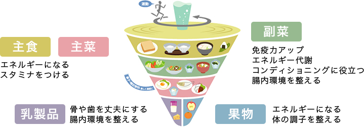 食事バランスガイドにある主食や主菜はエネルギーになる食材を含み、スタミナをつけるのに役立ちます。