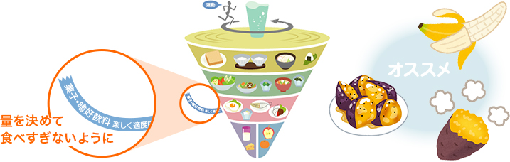 食事バランスガイドにもあるように、お菓子やジュースはコマの勢いを増すためのヒモの部分ですので、生活をよりよくするための「楽しみ」として、量を決めて食べすぎないように注意をしましょう。