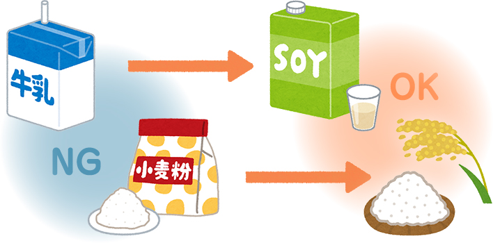 牛乳であれば豆乳、小麦粉であれば米粉といった状態が似たものであれば代わりになりやすい傾向にあります。