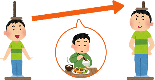 低学年であれば高学年、高学年であれば中学生や高校生など少し年上の人たちを見て、成長する(背が伸びたり、体つきがしっかりする)という事を想像させ、そうなるためには「食べる事」が大切であると伝えましょう。