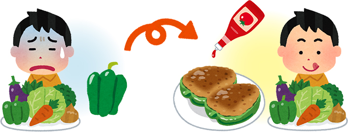 例えば生のピーマンは青くさいから嫌いでも、お肉と一緒に焼いてケチャップがかかっていると、青くささが少なく甘みも感じられてすき、ということはありませんか?