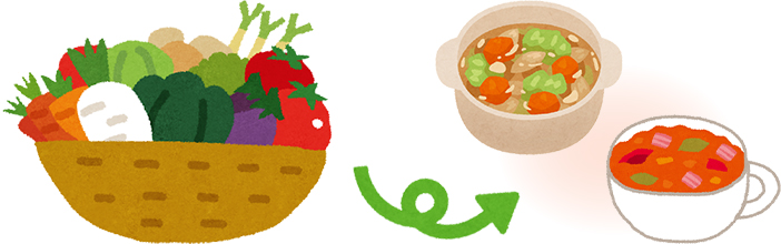 みそ汁、野菜スープ、ポトフなど具沢山にすることで1皿でも水分だけでなく、栄養をしっかり摂ることができます。