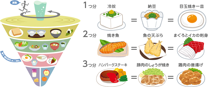 ざっくりと食事のバランスを考える時には、まずは「該当のグループに含まれる食材を、適切な量で食べられているか?」をチェックしていただきたいと思いますが、その中でいろいろな種類の食材を食べるようにすると、いろいろな栄養成分をからだに取り入れることができます。肉だけでなく、魚も、卵も、大豆製品も食べるようにできると良いですね。食事の内容を振り返って「最近肉が多いかな」というような時には、意識して魚を食べるようにするなどして調整してみてはいかがでしょうか。
