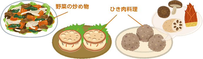・ひき肉料理…食感のある食材と合わせる。タケノコやシイタケなどを刻んで混ぜ込んだ肉団子や、レンコンの挟み焼きなどもおすすめ!