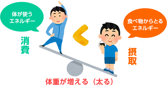 “食べ物からとるエネルギー(カロリー)の量”と“体が使うエネルギーの量”を比べた時に、食べ物からとるエネルギーの方が多ければ、体重は増えます。