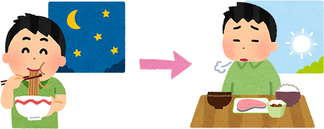 そのため、寝る直前にたくさん食べると、寝つきが悪くなるだけでなく、胃はすべて消化できずに次の日の朝起きた時に「おなかに何か残っている感じ」や「胃がむかむ