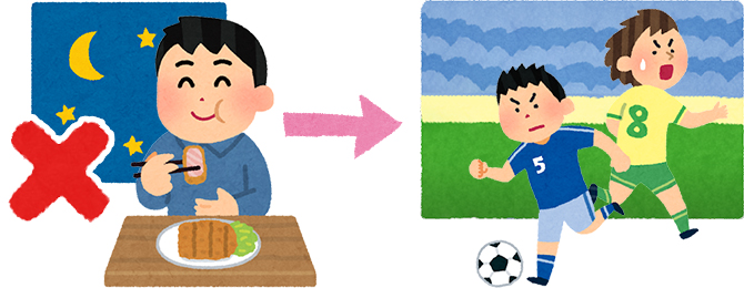 そのため、試合直前に食べてしまうとなかなか消化されずに、「体が重い」「走ると気持ち悪くなる」などの消化不良の原因にもなります。