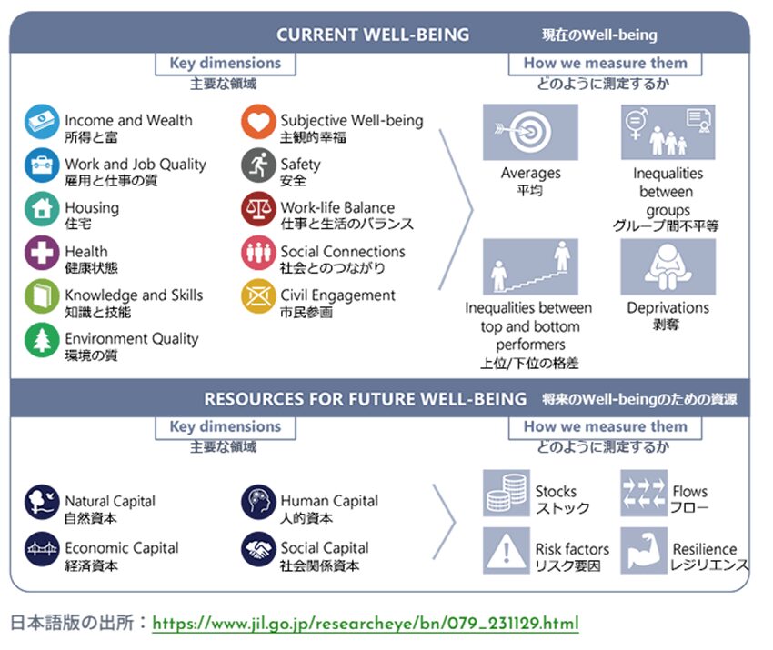 今、世界的には2030年以降の目標としてポストSDGsの議論が進められています。その中の1つの軸として注目されているのが、心身のみならず社会的にも満たされた状態であることを示す「ウェルビーイング」という概念です。OECD(経済協力開発機構)のフレームワークでは、個人のウェルビーイングに影響する要素として「所得」「安全」「仕事と生活のバランス」「健康状態」など11項目が挙げられています。
